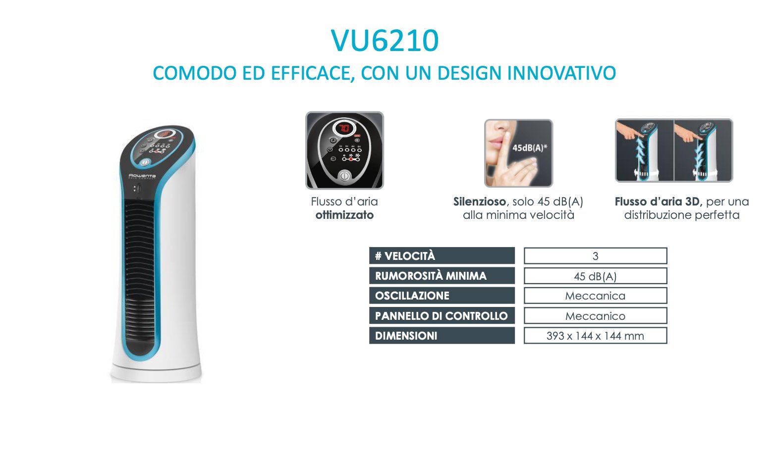 Ti presentiamo un effetto rinfrescante unico nel suo genere. Scopri un mini ventilatore a torre che non scende a compromessi sulla potenza o sul design, offrendo un flusso d'aria perfetto per stare sempre al fresco. La tecnologia del flusso d'aria 3D garantisce una velocità efficiente su 3 impostazioni regolabili, per una freschezza personalizzata adatto alle tue esigenze. Un ventilatore a torre che si adatta a qualsiasi casa, con comode funzionalità che offrono il massimo comfort d'uso, oltre a un design portatile, un’impugnatura integrata e un comodo vano portacavo che lo rendono facile da trasportare e riporre.