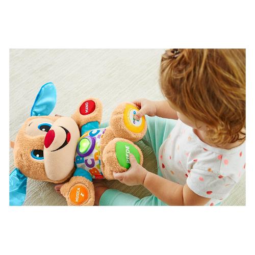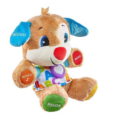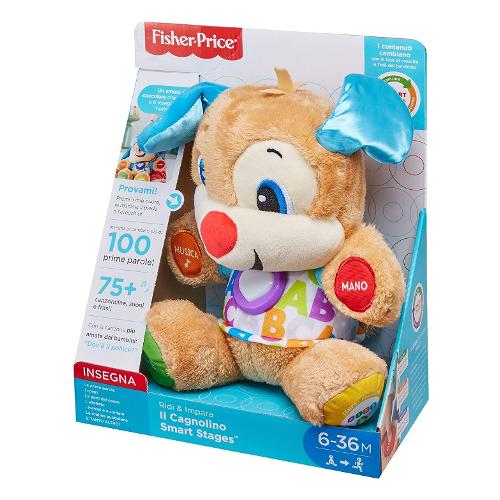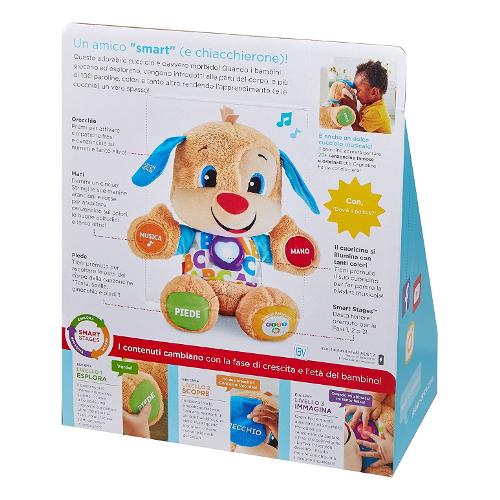 Il migliore amico dei bambini è arrivato! Cagnolino è morbido, coccolone e pronto per tantissime ore di gioco con tante cose tutte da imparare. Risponde al tocco del bambino con adorabili canzoncine e frasi che introducono oltre 100 paroline da imparare, parti del corpo, colori, forme e tanto altro! E poiché ogni bambino impara seguendo i propri ritmi, cagnolino è dotato di tecnologia smart stages™, così potrete impostare il livello più adatto al vostro bimbo. Una varietà di canzoncine, suoni e frasi con ognuno dei tre livelli di gioco. E anche il cuoricino luminoso multicolore di cagnolino si illumina a ritmo di musica! Livello 1 - esplora - il bambino può premere le mani, il piede, il cuoricino, il naso o l'orecchio di cagnolino per ascoltare le prime paroline, i colori, l'alfabeto, le parti del corpo e tanto altro ancora! Livello 2 - scopri - in questo livello, le simpatiche frasette premiano i piccoli quando contano, trovano i colori e identificano le parti del corpo! Livello 3 – immagina – cagnolino è pronto per giocare con simpatiche canzoncine da imparare e frasette che il bambino amerà, il tutto espandendo il proprio vocabolario!