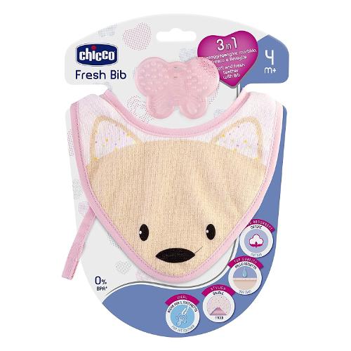 Chicco fresh bib unisce un comodo bavaglino realizzato in cotone extra morbido ad un fresco massaggia gengive, ideale per donare sollievo alle gengive del bambino durante il periodo della dentizione.