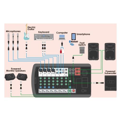 Sistema PA portatile da 400 watt, con mixer amplificato a 8 canali, due diffusori da 8", una entrata Bluetooth, riverberi digitali SPX, soppressore del feedback incorporato ed EQ versatile.