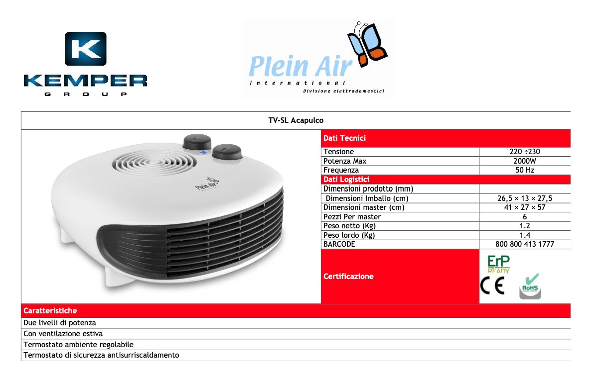 Termoventilatore elettrico con 2 livelli di potenza. Funzione riscaldamento e ventilazione estiva. Termostato ambiente regolabile e termostato di sicurezza antisurriscaldamento. Colore bianco. Adatto per riscaldare o ventilare bagni e stanze di piccole dimensioni grazie al suo ingombro ridotto.