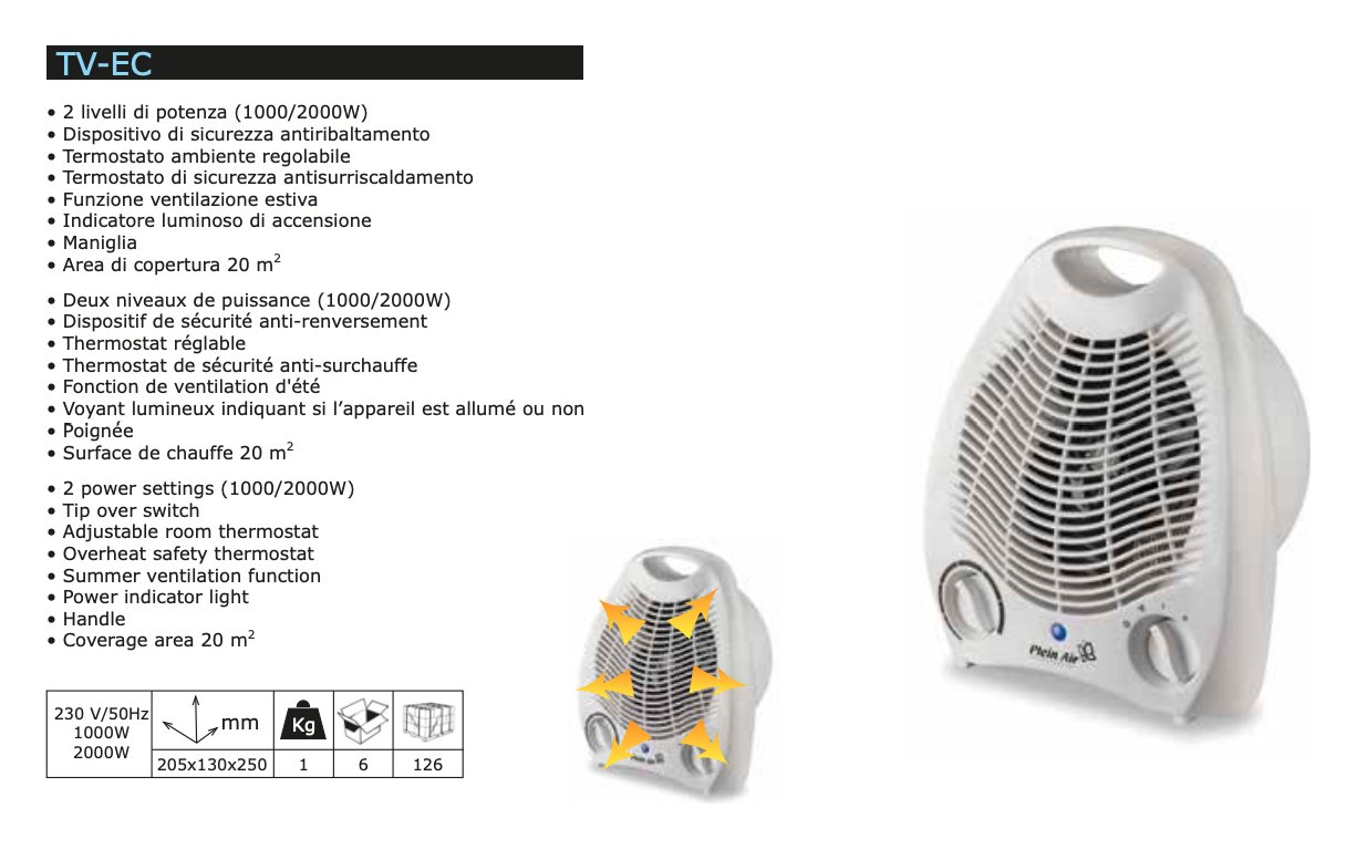 Termoventilatore elettrico con 2 livelli di potenza. Funzione riscaldamento e ventilazione estiva. Termostato ambiente regolabile e termostato di sicurezza antisurriscaldamento. Superficie di copertura 20 mq. Colore bianco. Adatto per riscaldare o ventilare bagni e stanze di piccole dimensioni grazie al suo ingombro ridotto. Dotato di maniglia per consentire un facile trasporto.