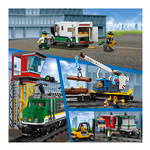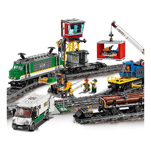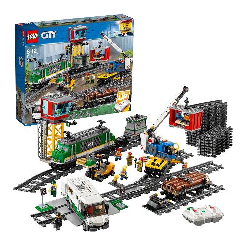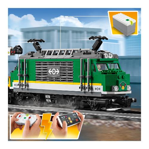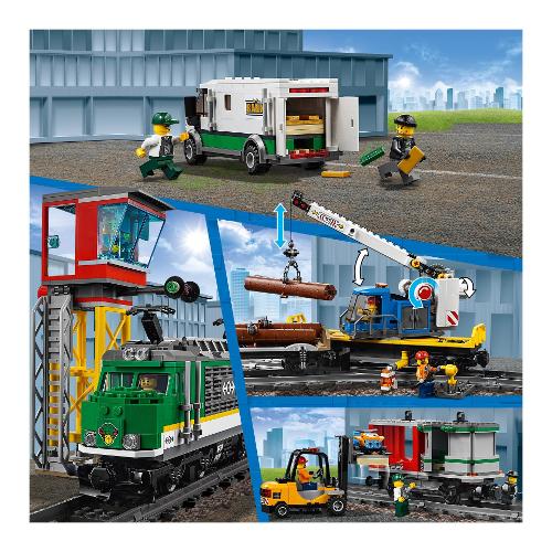 Carica il potente Treno merci LEGO® City 60198 e consegna le merci in tempo! Questo fantastico set LEGO City contiene un locomotore con telecomando Bluetooth a 10 velocità, cabina di guida accessibile, carro gru con braccio girevole ed estensibile, vagone container con 2 container e carro legname, più un furgone blindato con sportelli apribili e un carrello elevatore con roll bar apribile e forche di sollevamento