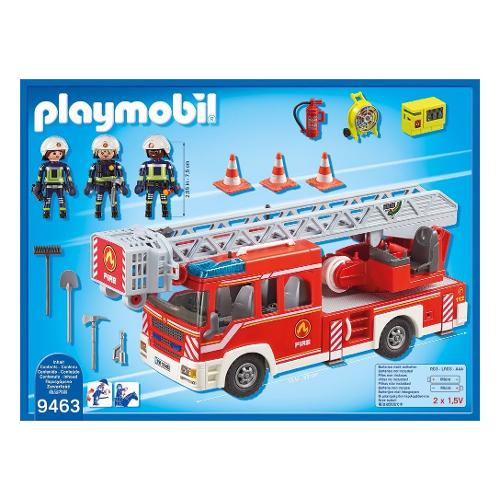 Compatibile con modulo RC. Il veicolo ha luci e suoni (richiede 2 batterie AAA 1,5V). La cabina di guida può contenere fino a 4 personaggi. È compatibile con la pompa d'acqua dell'art. 9468 Squadra dei Vigili del Fuoco.