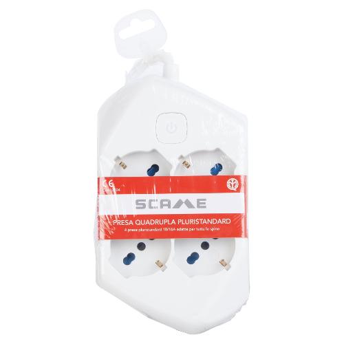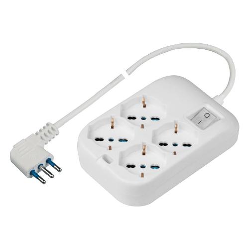 Prese multiple 250v~ serie elix, con cavo e spina - presa multipla 250 v~ con 4 prese pluristandard 10 / 16 a 2p+t, standard italiano 10 / 16 a e tedesco 16 a (con terra laterale), 1,5 m cavo con spina salvaspazio 16 a 2p + t uscita cavo a 90°, interruttore luminoso. Colore: bianco. Le prese pluristandard consentono il collegamento di tutte le spine standard italiano e tedesco, essendo inoltre inclinate di 45° facilitano l'inserimento di più spine ingombranti (es. alimentatori). Spegnendo l'interruttore è inoltre possibile risparmiare energia elettrica ed eliminare lo stand-by dei dispositivi elettronici.