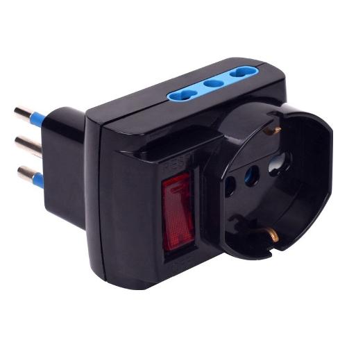 Adattatore con interruttore di sicurezza. In caso di sovraccarico l’interruttore interviene in modo automatico togliendo l’alimentazione ai dispositivi collegati. Dopo pochi secondi agendo sempre sull’interruttore è possibile ripristinare l’alimentazione. Le prese pluristandard consentono il collegamento di tutte le spine standard italiano e tedesco.