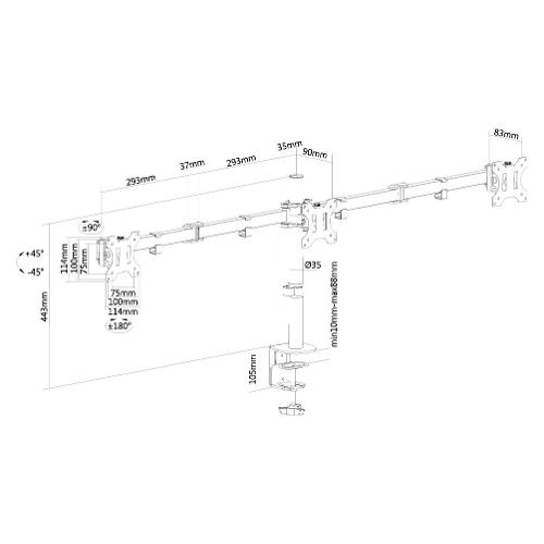 Il supporto FPMA-D550D3BLACK ha 3 punti di articolazione ed è adatto a schermi fino a 27" (69 cm) con una capacità massima di trasporto di 21 kg (7 kg per ogni schermo). Questo prodotto è adatto per schermi con fori VESA modello 75x75 o 100x100 mm.