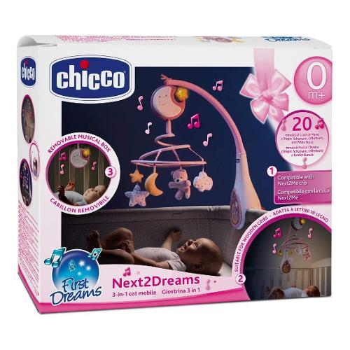 La giostrina next2dreams di chicco è un dispositivo musicale che offre la possibilità di riprodurre fino a 20 minuti di rilassante musica classica oppure una serie di rumori bianchi simili a quelli che il bimbo percepiva nel grembo materno, in grado di calmarlo e aiutarlo a prendere sonno. Una luce soffusa e dei teneri pendenti in tessuto anallergico contribuiscono a rendere più facile la fase di transizione tra la veglia e il sonno. Next2dreams rosa di chicco è dotato di un pannello elettrico removibile e, grazie al suo comodo sistema di aggancio, si presta ad essere montato sulla culla next2me e la maggior parte dei lettini in legno e da viaggio. Disponibile anche in blu o colore neutro.