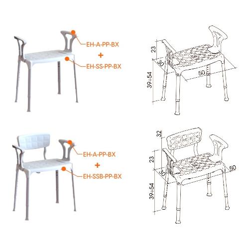 Realizzati per offrire un comodo sostegno, possono essere installati alle sedie da doccia con e senza schienale (eh-ss-pp-bx e eh-ssb-pp-bx). Vengono forniti in coppia e presentano una finitura antiscivolo