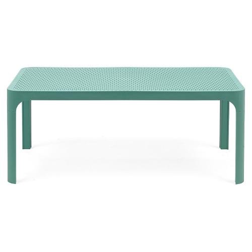 Elegante tavolo da appoggio in resina fiberglass colorata in massa con piano rettangolare caratterizzato da un motivo bucherellato che riprende il leitmotiv di tutta la collezione Net
