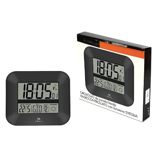 Orologio da parete/tavolo radiocontrollato con previsione delle condizioni meteo per le successive 12/24 ore. Funzione sveglia con snooze (ripetizione dopo 5 minuti). Indicazione della temperatura e dell’umidità interna. Calendario (giorno/mese/anno) con giorno della settimana disponibile in 7 lingue (italiano, francese, inglese, tedesco, spagnolo, olandese, danese).