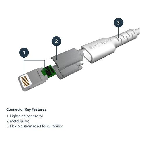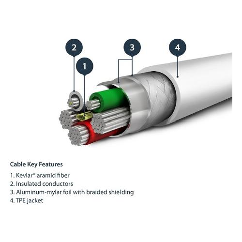 Dotato di rinforzo in fibra aramidica Kevlar®, questo resistente cavo Lightning è protetto dalle sollecitazioni indotte dalle frequenti piegature e torsioni e resiste quindi alla flessione senza stiramenti eccessivi.