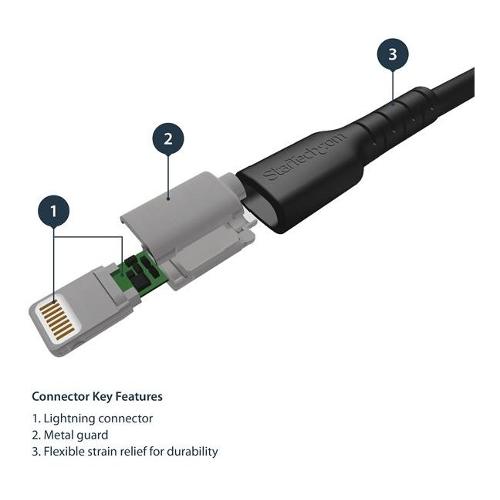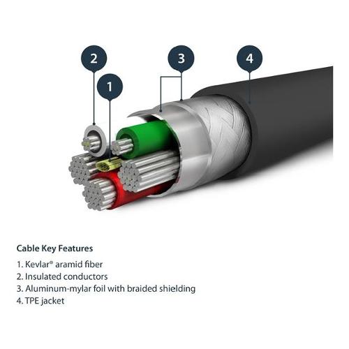 Dotato di rinforzo in fibra aramidica Kevlar®, questo resistente cavo Lightning è protetto dalle sollecitazioni indotte dalle frequenti piegature e torsioni e resiste quindi alla flessione senza stiramenti eccessivi.