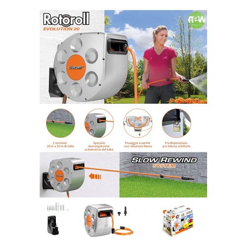Avvolgitubo con riavvolgimento automatico, dotato di esclusivo meccanismo slow rewind per un utilizzo confortevole e sicuro. Pronto all’uso con 20 m di tubo speciale indeformabile con superficie anti-attrito per un avvolgimento rapido e perfetto. Costruito con materiali resistenti agli urti e ai raggi solari per garantire la massima durata nel tempo. Il supporto a muro in resina rinforzata, con perno in alluminio inossidabile, permette di orientare fino a 180° l’avvolgitubo nella direzione di utilizzo, evitando pieghe e strozzamenti del tubo. Dotato di prolunga per il collegamento al rubinetto (1,5 m), presa 3/4” (20-27 mm), raccordi automatici e lancia a spruzzo. Completo di supporto a muro, viti e tasselli per il montaggio a parete.