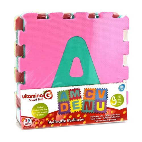 Morbide e colorate mattonelle 32x32 cm, 9 pezzi. Le lettere al centro di ogni mattonella sono ad incastro. Le mattonelle si possono unire tra loro ed essere utilizzate come base gioco: superficie antiscivolo e lavabile