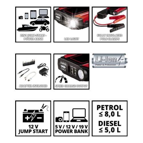 Il Power Bank Einhell CC-JS 18 Jump Start è un jump-start compatto e maneggevole e una centrale elettrica che è bello avere in macchina e quando sei in viaggio. Con una sola unità, puoi avviare l'auto quando la batteria è scarica, e puoi ricaricare in modo rapido e semplice telefoni cellulari, computer portatili, fotocamere, ecc. La batteria ai polimeri di litio ad alta capacità 3 x 6000 mAh (computazionalmente) offre tutto il potenza di cui hai bisogno. Lo stato di carica è mostrato sul display a LED. Anche la luce di lavoro a LED sulla piccola centrale elettrica con luce fissa, luce stroboscopica e segnale SOS per varie situazioni di emergenza può essere molto utile. Il Power Bank ha un'uscita USB 5V / 1A / 2A, un'uscita 12V / 10A (per compressori / gonfiatori nell'automobile) e un'uscita 19V / 3,5A (per notebook e laptop) per fornire una fonte di alimentazione portatile per una ricarica rapida e alimentando un'ampia varietà di dispositivi. Cavi jumper con morsetti completamente isolati e protezione da sovraccarico per il collegamento alla Power Bank, un cavo adattatore USB, un cavo adattatore con 8 adattatori per notebook diversi (adatto per Dell, HP, IBM, Lenovo, Toshiba, Sony, Samsung, Acer, Asus, Fujitsu, NEC, ecc.), Un adattatore di ricarica da 230 V e un cavo di ricarica da 12 V con presa per accendisigari sono inclusi insieme a una pratica custodia protettiva per riporre la Power Bank e gli accessori.