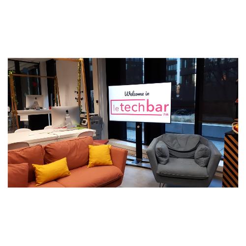 Stand da pavimento bicolor ideale per le applicazioni di Digital Signage nelle hall degli alberghi o in corrispondenza di sale congressi e aule universitarie.