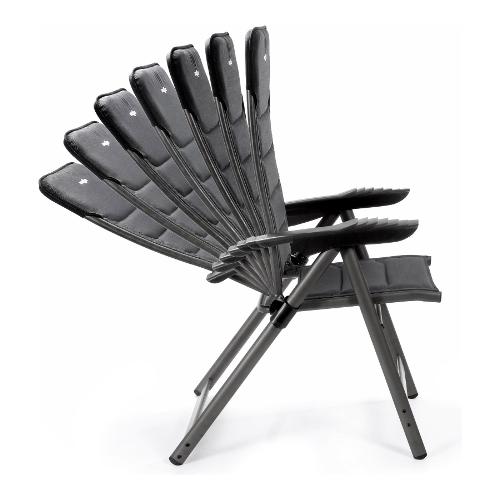 Sedia pieghevole ultrapiatta con schienale reclinabile. Struttura in profilato ovale di alluminio, schienale reclinabile a 7 posizioni. Ultrapiatta quando ripiegata. Realizzata in Licotex (73% PVC/27% PES)