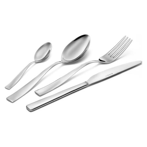 Infinity è una posata dall'eleganza quotidiana. Il design minimale delle larghe manicature come nastri sinuosi, la forma sagomata e allungata della coppa dei cucchiai e la sobrietà della silhouette delle forchette evocano un'idea di purezza e di infinito.