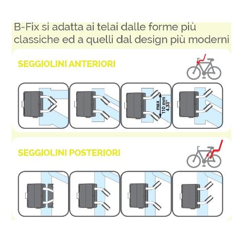 B-fix si adatta ai telai dalle forme più classiche ed a quelli dal design più moderno. Sistema brevettato per attacco al telaio sotto il manubrio e sotto la sella.