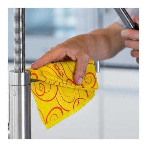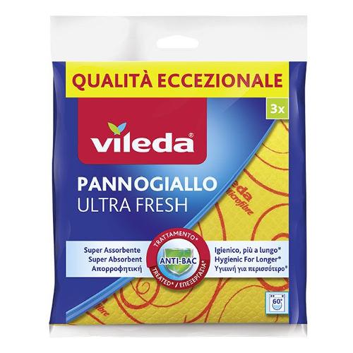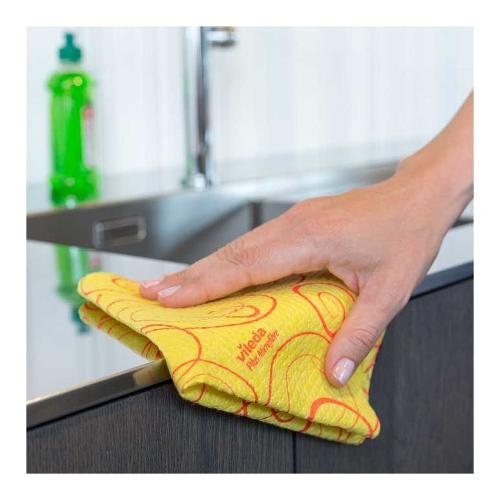 Vileda pannogiallo contiene il 30% di microfibra, assorbe i liquidi come una spugna e attrae le particelle di sporco e capelli come una calamita.