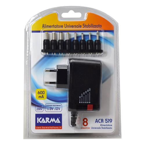 Alimentatore da 600mA operante in automatico sia a 110V che a 220V. Otto adattatori inclusi per ogni tipo di apparecchio. I voltaggi supportati sono: 3 / 4,5 / 5 / 6 / 9 e 12V. Ideale per l’impiego in abbinamento a lettori DVD portatili, lettori Mp3 etc.