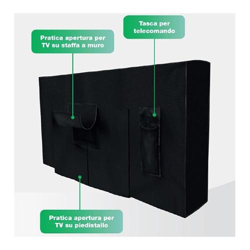 Adatto per TV su staffa a muro e per TV da appoggio. Protegge il televisore dall'umidità, dalla polvere e dai raggi solari. È impermeabile ed adatto anche all'aperto. Fornito di tasca per telecomando. Aperture in velcro. Doppia cucitura per una massima resistenza. In dotazione panno in microfibra antigraffio per pulire lo schermo.