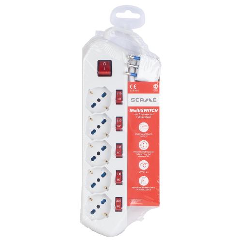 Presa multipla 250v~ con 5 prese pluristandard 10/16 a 2p+t, standard italiano 10/16a e tedesco 16a con terra laterale, 1,5m cavo con spina 16a 2p+t, uscita cavo a 90°, interruttore luminoso generale e 5 interruttori singoli su ogni presa, ce, csv-imq