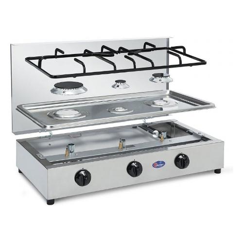Fornello 3 fuochi, bruciatori in lega Pyral N2, spartifiamma smaltati, griglia smaltata.
