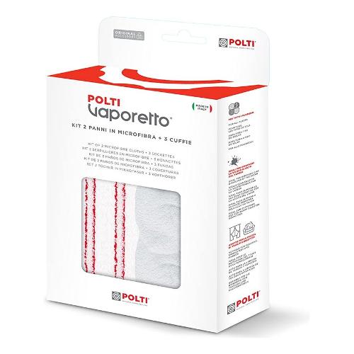 Kit composto da 2 panni in microfibra e 3 cuffie in spugna: i panni sono ideali per la pulizia di tutti i tipi di pavimenti, anche i più delicati, e scorrono facilmente grazie agli inserti in poliestere, mentre le cuffie sono indicate per la pulizia dei tessuti o delle superfici dure. Compatibile con tutti i modelli di Polti Vaporetto serie Pro, serie Classic, Eco Pro.