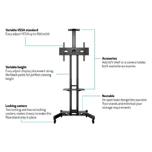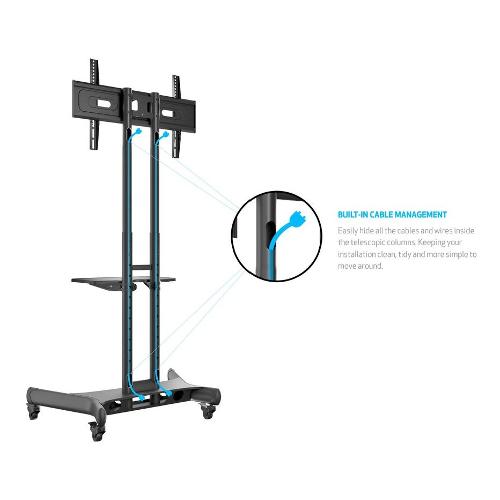 Solido carrello a doppia colonna per schermi di grosso formato: supporta fino a 50 kg ed è quindi adatto alle piu’ svariate esigenze in ambito aziendale di videoconferenza e comunicazione.