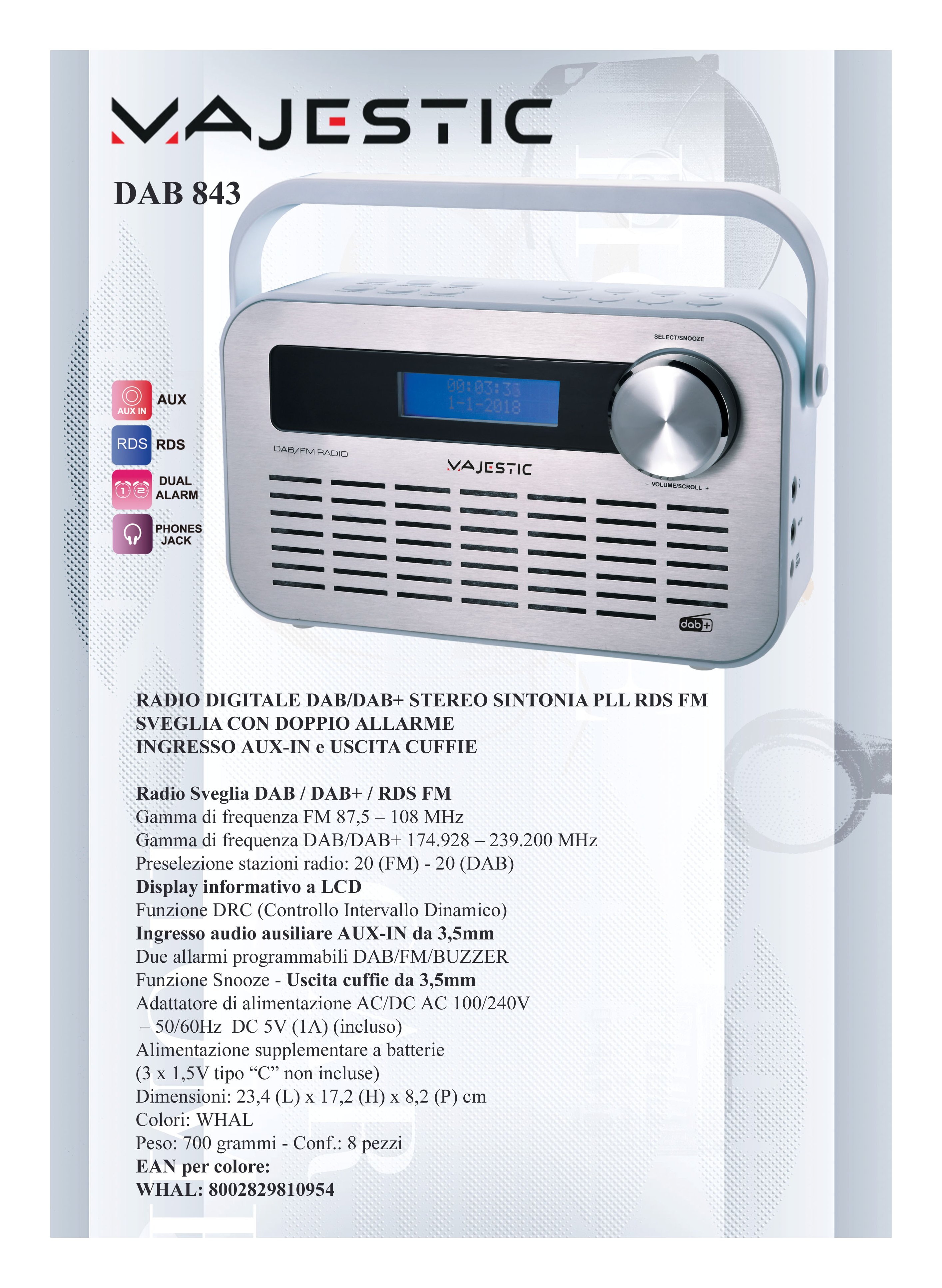 Radio sveglia con doppio allarme. Uscita cuffie.