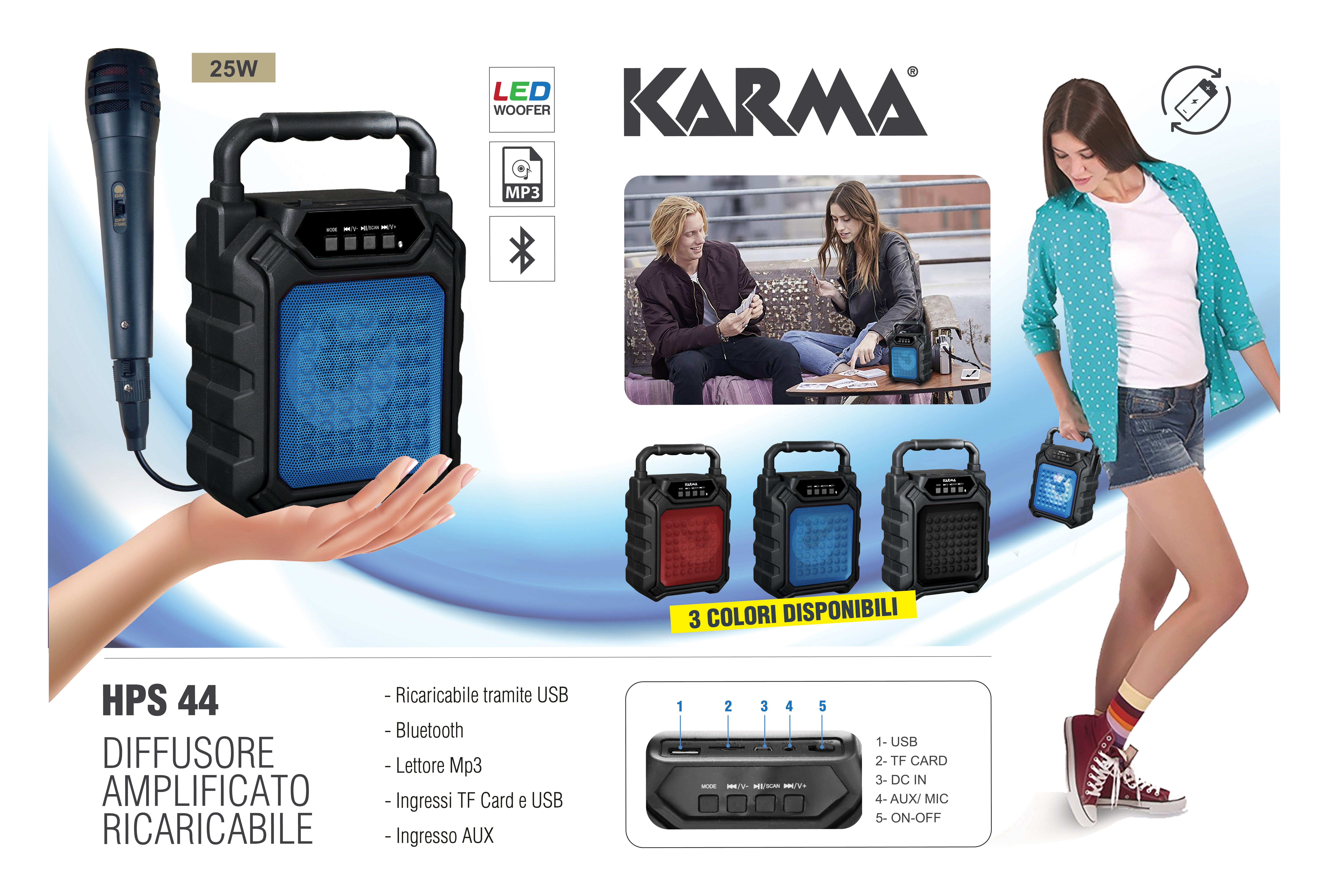 Diffusore amplificato a batteria. Piccolo e compatto ma completo di tutte le funzioni richieste dai ragazzi che vogliono ascoltare musica in completa libertà. Incorpora un modulo bluetooth per ricevere musica direttamente dal proprio telefono. E' in grado di leggere files MP3 da schede micro SD e possiede persino un ingresso ausiliario 3,5mm. La batteria si ricarica direttamente da una qualsiasi presa USB (cavo in dotazione) e garantisce ore di riproduzione. La struttura robusta e il peso ridottissimo.