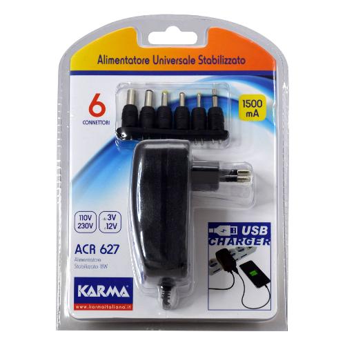Alimentatore stabilizzato operante sia a 110V che a 220V. Le tensioni fornite in uscita sono impostabili su: 3, 4.5, 5, 6, 7.5, 9, 12V con potenza costante di 1500mA. Un led indica la corretta alimentazione. Nella confezione sono inclusi 6 adattatori. Dotato di presa USB per l'alimentazione in contemporanea anche di smartphone o altri apparecchi dotati di tale presa.