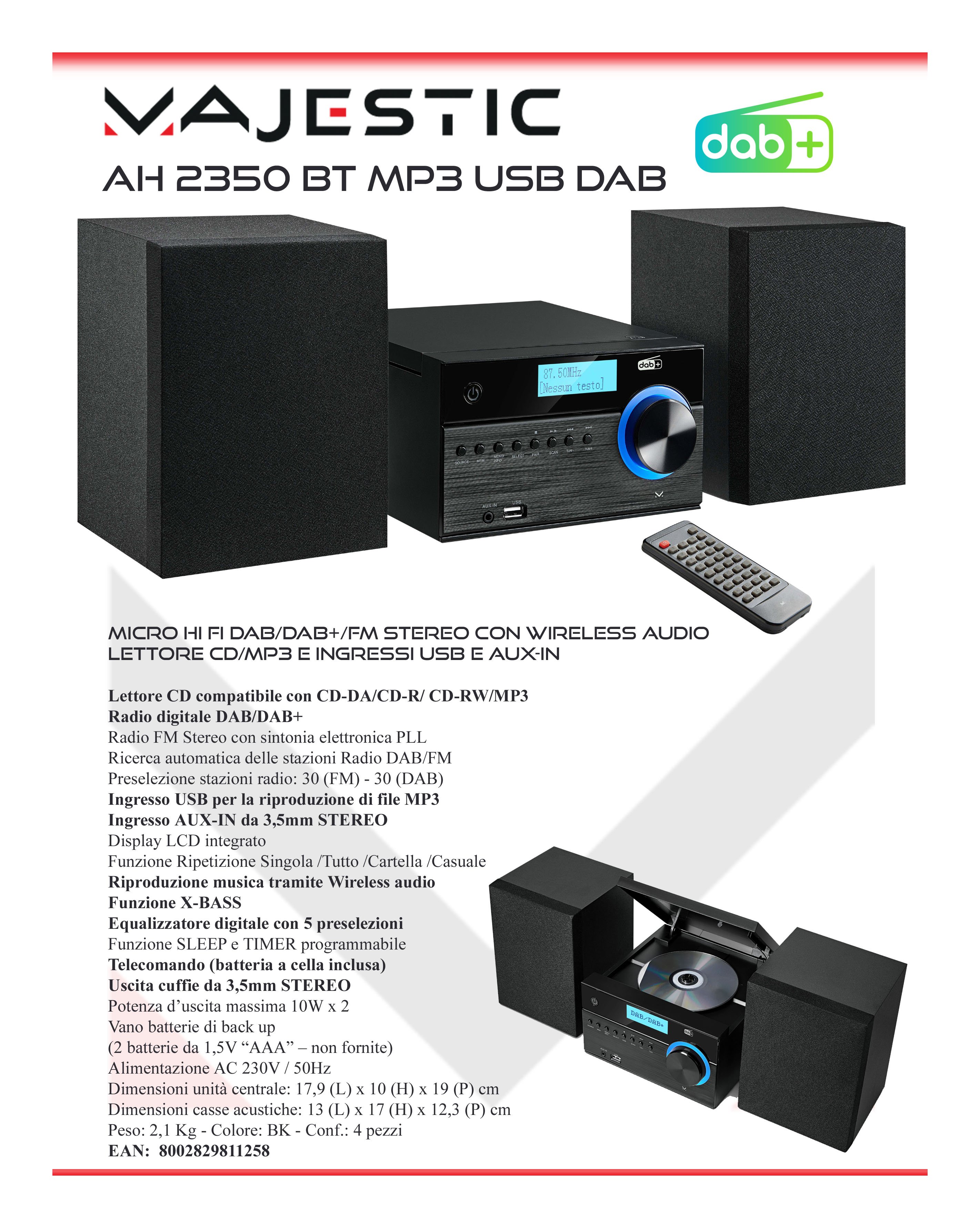 Questo moderno Micro HI-FI ti permetterà di ascoltare la tua musica preferita in diversi modi. Lettore CD/MP3, Radio sia DAB che FM, Ingresso USB per riprodurre file mp3, ingresso AUX-IN per collegare una fonte audio esterna, Wireless audio per connettere il tuo smartphone e tablet. Dotato di telecomando e di uscita cuffie è un impianto completo con misure molto contenute