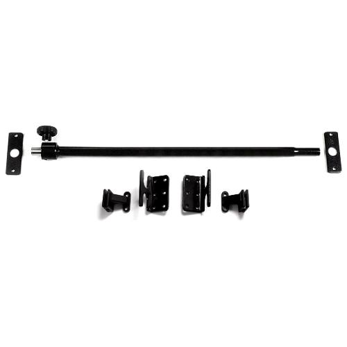 1 sbarra in tubo di ferro, 1 tubo in acciaio inox estensibile, 2 ganci in ferro blocca anta, 2 piastre a muro in ferro, 1 coppia Blindy Top in pvc rinforzato, pomolo in nylon, Viteria e tasselli per l’installazione