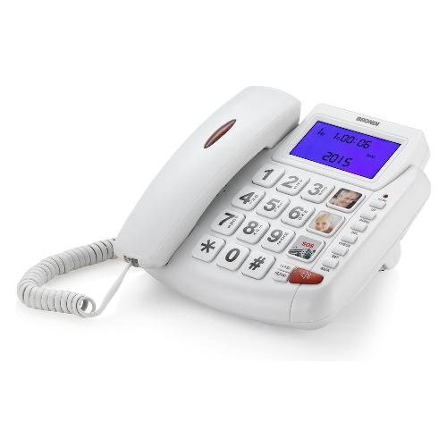 Il telefono fisso per anziani Bravo 90 LCD è particolarmente indicato per la fascia senior, infatti possiede grandi tasti in rilievo e ben spaziati, un ampio display alfanumerico retroilluminato di facile lettura, il vivavoce ad alto volume per parlare a mani libere ed è compatibile con apparecchi acustici.