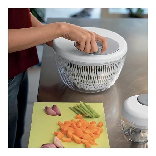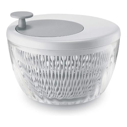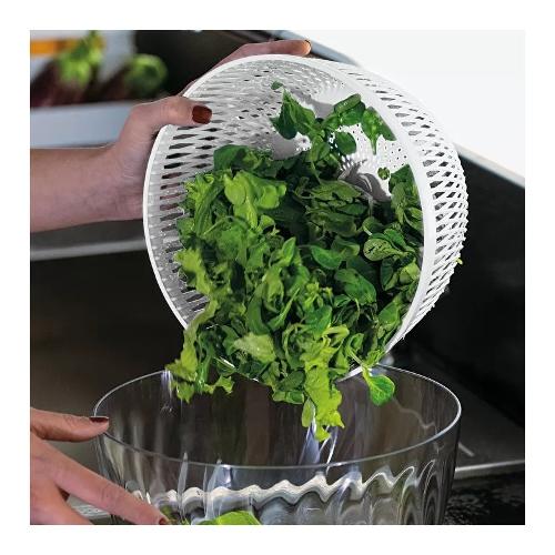 Centrifuga per insalata spin&store lava e asciuga l'insalata e tutte le verdure a foglia grande in modo rapido ed efficace. Dal design compatto, il suo contenitore, può diventare un'elegante insalatiera da portare in tavola. Il cestello all'interno è dotato di piedini che lo tengono sollevato dalla base del contenitore: questo particolare permette di utilizzare la centrifuga anche come contenitore per scongelare i cibi che, restando sollevati dal fondo grazie ai piedini, non rimangono bagnati. La centrifuga è inoltre dotata di un coperchio salvafreschezza che, applicato al contenitore, permette di conservare in frigo le verdure.