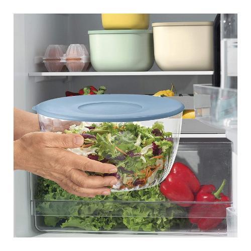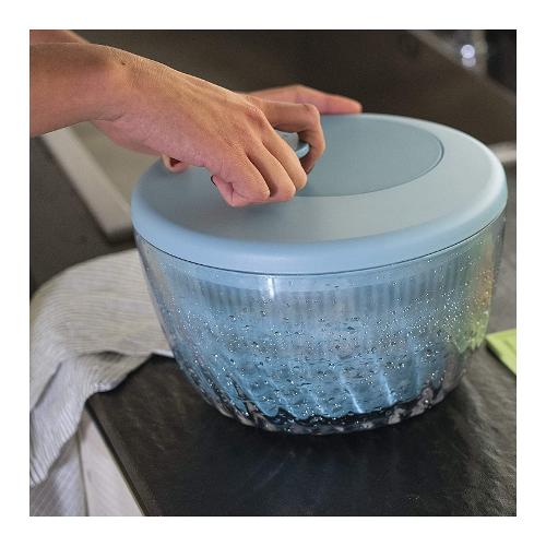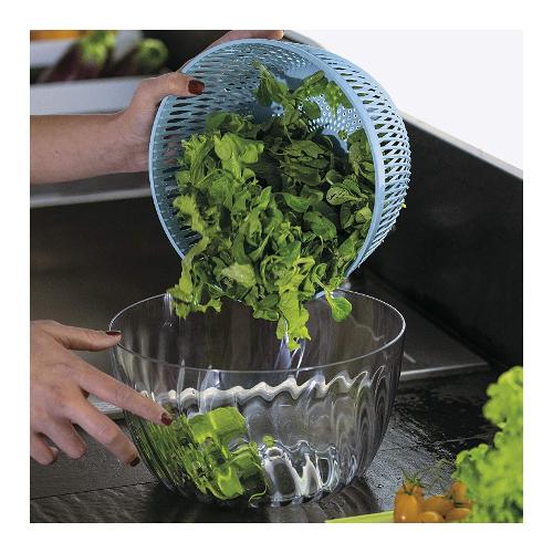 Centrifuga per insalata spin&store lava e asciuga l'insalata e tutte le verdure a foglia grande in modo rapido ed efficace. Dal design compatto, il suo contenitore, può diventare un'elegante insalatiera da portare in tavola. Il cestello all'interno è dotato di piedini che lo tengono sollevato dalla base del contenitore: questo particolare permette di utilizzare la centrifuga anche come contenitore per scongelare i cibi che, restando sollevati dal fondo grazie ai piedini, non rimangono bagnati. La centrifuga è inoltre dotata di un coperchio salvafreschezza che, applicato al contenitore, permette di conservare in frigo le verdure.
