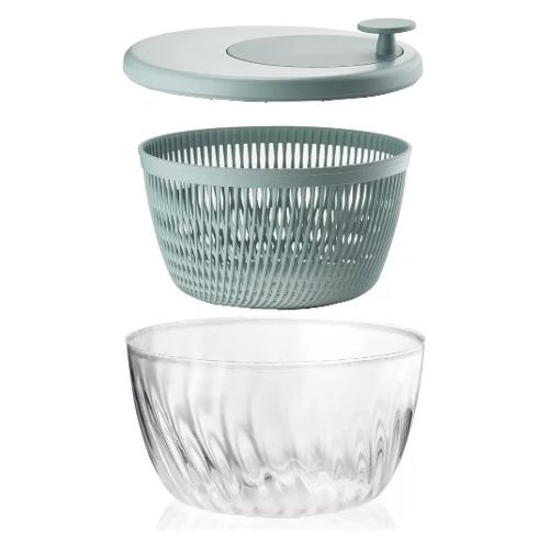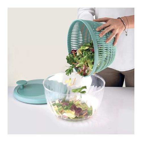 Centrifuga per insalata spin&store lava e asciuga l'insalata e tutte le verdure a foglia grande in modo rapido ed efficace. Dal design compatto, il suo contenitore, può diventare un'elegante insalatiera da portare in tavola. Il cestello all'interno è dotato di piedini che lo tengono sollevato dalla base del contenitore: questo particolare permette di utilizzare la centrifuga anche come contenitore per scongelare i cibi che, restando sollevati dal fondo grazie ai piedini, non rimangono bagnati. La centrifuga è inoltre dotata di un coperchio salvafreschezza che, applicato al contenitore, permette di conservare in frigo le verdure.