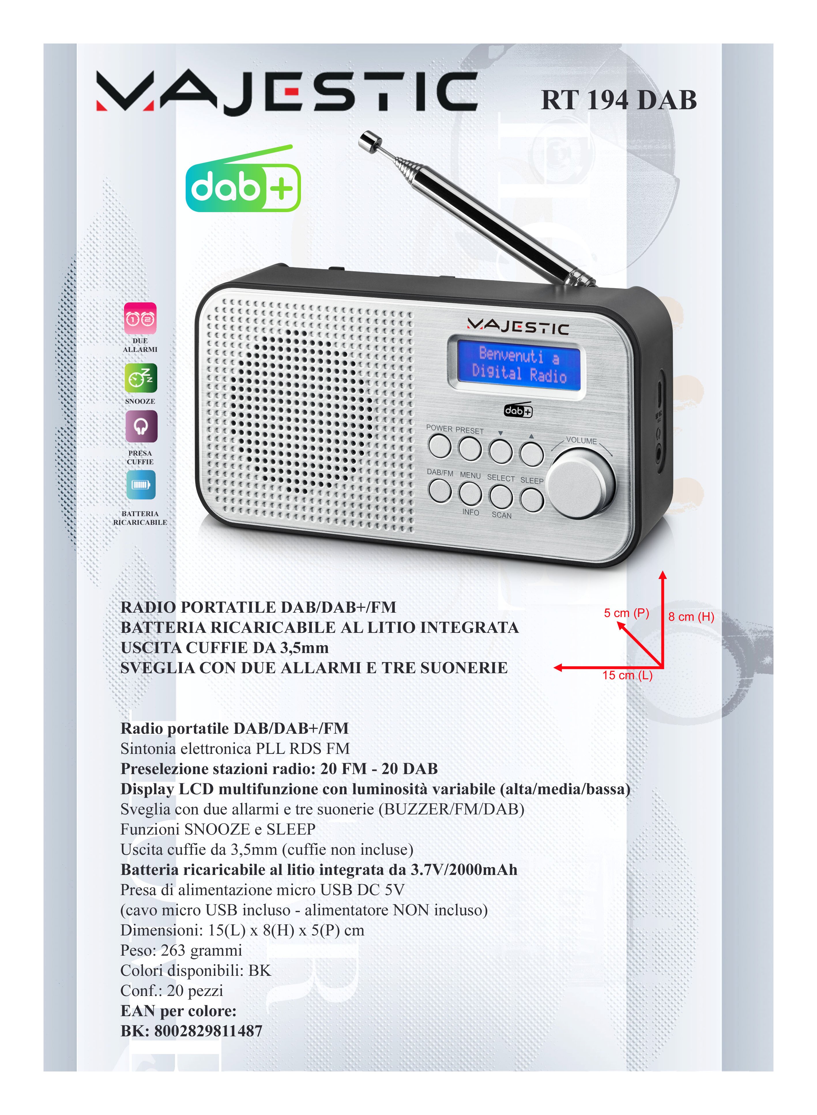 Radio sveglia con due allarmi e tre suonerie. Batteria ricaricabile al litio integrata da 3.7V/2000mAh. Uscita cuffie