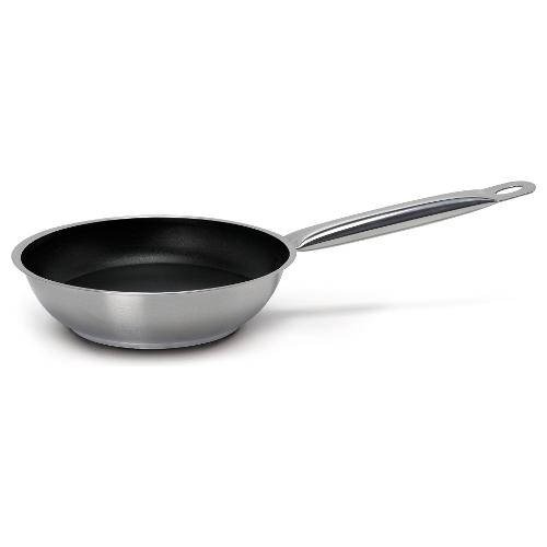 Fondo termo diffusore sandwich a tre strati: acciaio/alluminio/acciaio, adatto per tutte le fonti di calore incluse quelle ad induzione. Manicatura professionale in acciaio tubolare per un'ottima presa, saldata con flangia di rinforzo. Maniglia dalla presa ampia e solida.