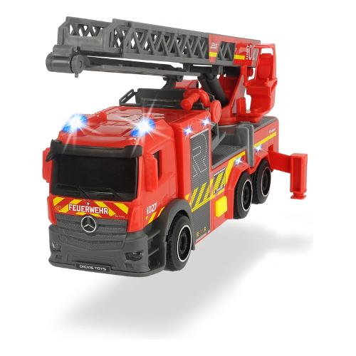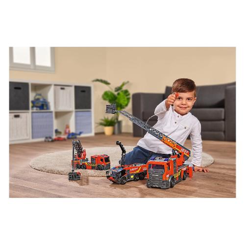 Questa autopompa dickie toys viene fornita con una scala girevole e caratteristiche dettagliate di noti modelli di autopompa. La cabina è progettata nello stile dei tipici camion mercedes benz, mentre il design esterno è ispirato a rosenbauer. L'impressionante camion giocattolo è dotato anche di ruote funzionanti, luci ed effetti sonori, oltre a una scala girevole ed estensibile e gambe estensibili. Inoltre viene fornito con batterie