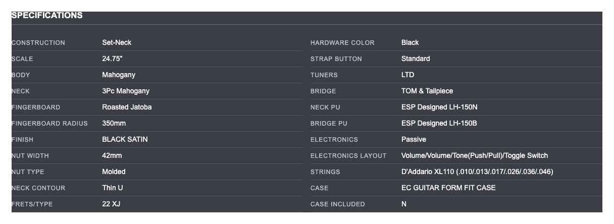 Una forma classica eccellente per tutti gli stili e i generi musicali, l'EC-256 ha un aspetto fantastico con attacchi multipli sul corpo e sulla paletta come ci si aspetta da chitarre di alta qualità. Anche suonare l'EC-256 è un sogno che si avvera, con la costruzione a collo fisso per un accesso facile e veloce ai tasti più alti. L'EC-256 presenta anche un corpo in mogano, un comodo e veloce manico in mogano sottile a forma di U in tre pezzi e una tastiera in jatoba arrostito con intarsi a bandiera e 22 tasti extra-jumbo. Questa chitarra presenta i nostri acclamati pickup humbucking ESP Designed LH-150 che offrono un suono eccezionale per tutti i generi musicali,