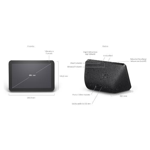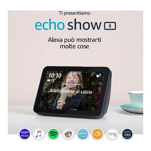 Echo Show 8 si connette ad Alexa per mostrarti immagini nitide su uno schermo HD da 8” e offrirti un audio stereo potente. Segui il testo di una canzone sullo schermo con Amazon Music, imposta timer e sveglie, mostra le tue foto preferite, controlla il meteo e la situazione del traffico prima di uscire di casa e resta sempre aggiornato sulle ultime notizie.
