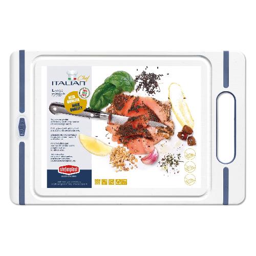 Il tagliere italian chef è un accessorio indispensabile per preparare i cibi senza danneggiare il ripiano della cucina. Leggero e maneggevole, è dotato di un pratica impugnatura ergonomica che permette inoltre di appenderlo alla parete e di piedini in gomma antiscivolo per una maggiore stabilità. Igienico e lavabile in lavastoviglie, aiuta a preservare le lame dei coltelli.
