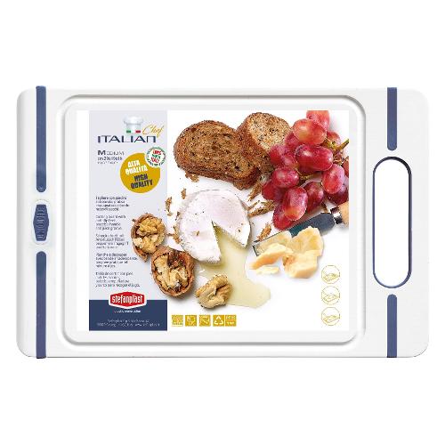 Il tagliere italian chef è un accessorio indispensabile per preparare i cibi senza danneggiare il ripiano della cucina. Leggero e maneggevole, è dotato di un pratica impugnatura ergonomica che permette inoltre di appenderlo alla parete e di piedini in gomma antiscivolo per una maggiore stabilità. Igienico e lavabile in lavastoviglie, aiuta a preservare le lame dei coltelli.