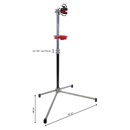 Cavalletto per la riparazione, manutenzione e rimessaggio della bici . Stabile,robusto, idoneo per bici da strada,mtb e city-bike . Regolazione telescopica . Regolabile in altezza e profondità . Pinza con sistema autocentrante e rotazione di 360 . Fornito con vaschetta porta-utensili . Portata max 18 kg