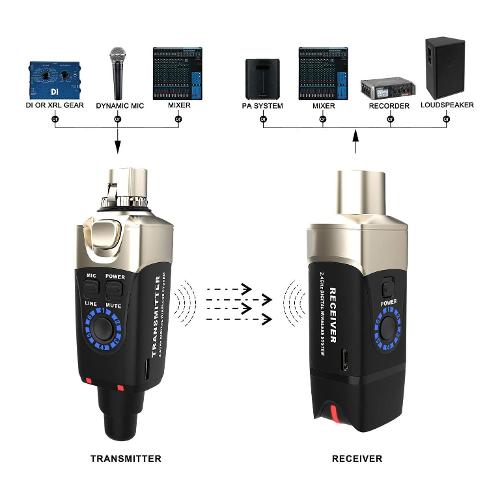 Il sistema è composto da un'unità trasmittente, che si collega al microfono; e un ricevitore, che si collega a un mixer, un'interfaccia audio, un preamplificatore, un cavo XLR o uno snake.