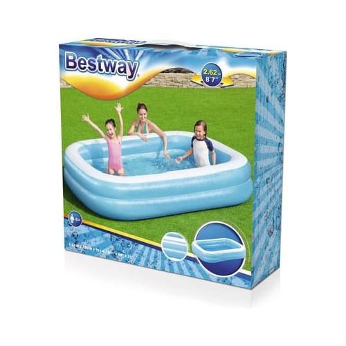 Bestway 54006. Colore del prodotto: blu, bianco, materiali: vinile, età consigliata (min): 6 anno/i. Capacità: 778 l, larghezza: 2620 mm, profondità: 1750 mm. Tipo di imballo: scatola, larghezza imballo: 400 mm, profondità imballo: 400 mm. Quantità per pallett: 84 pezzo(i), ordine minimo: 3 pezzo(i)